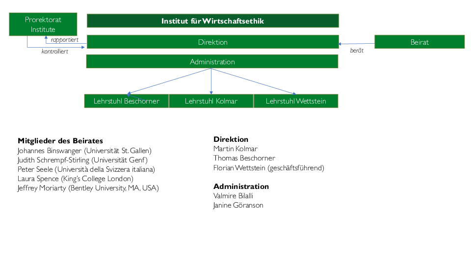 Florian Wettstein ist Professor für Wirtschaftsethik und Direktor des Instituts für Wirtschaftsethik. In seiner Forschung beschäftigt er sich vor allem mit der Schnittstelle zwischen Wirtschaftsethik und Menschenrechten. Florian Wettstein ist Mitglied des Vorstands der International Society of Business, Economics, and Ethics (ISBEE) und Chefredakteur des Business and Human Rights Journal (BHRJ), das von Cambridge University Press herausgegeben wird.